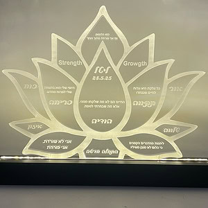 קבלתי בשמחה אות חרוטה מוארת עם כיתוב יפה ומעורר השראה, מזכרת יפה ומכובדת, אישית ומושקעת, מהחברים בעבודה לרגל פרישתי. האות מקשטת את ביתי ומוסיפה אוירה נעימה.