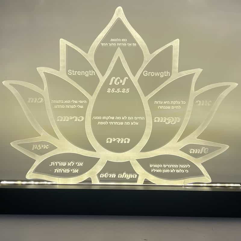 אות פרסונלית בעיצוב ייחודי, בה חרוטים שם, ערכים,משפטים אופייניים, תאריכים משמעותיים, מילים להשראה, לוגו או כל מסר משמעותי – על גבי פרספקס מואר בעובי 8–10 מ"מ,