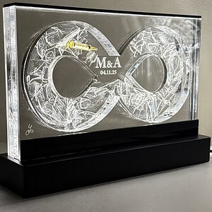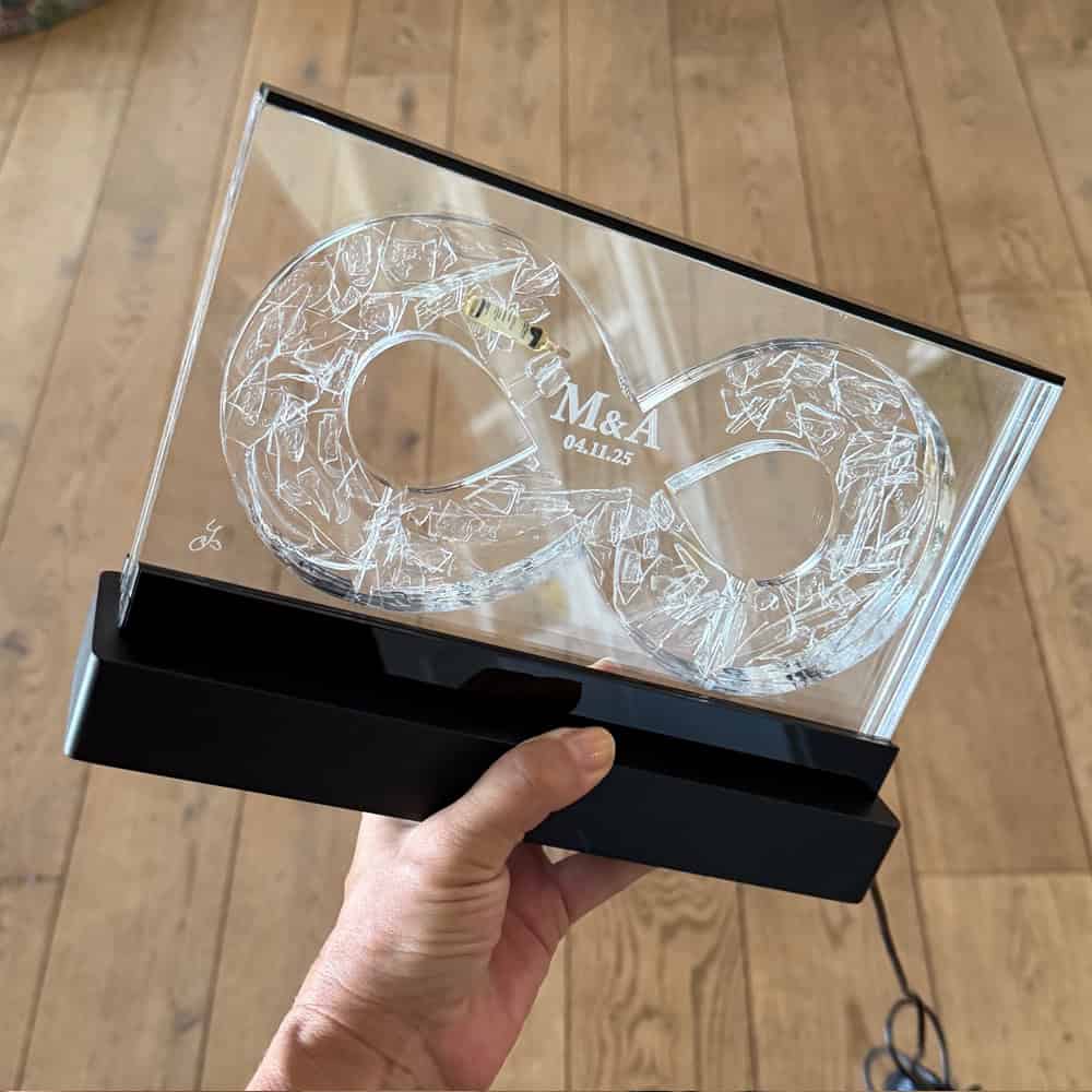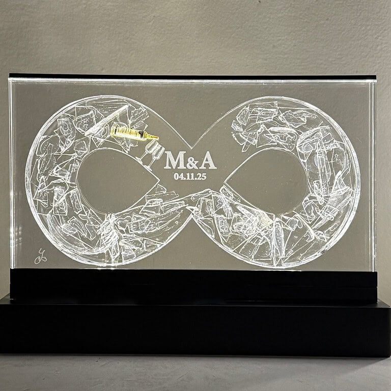 💎 אני מדביקה בעבודת יד את שברי כוס החופה המקוריים (למעט שברים זעירים מדי), בתוך פסל לב עשוי פרספקס שקוף, בגודל 23 ס"מ ובעובי 3 ס"מ.