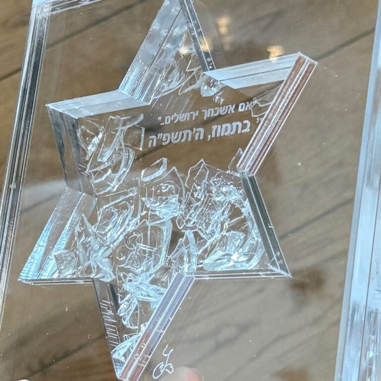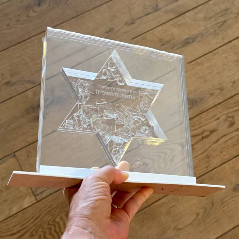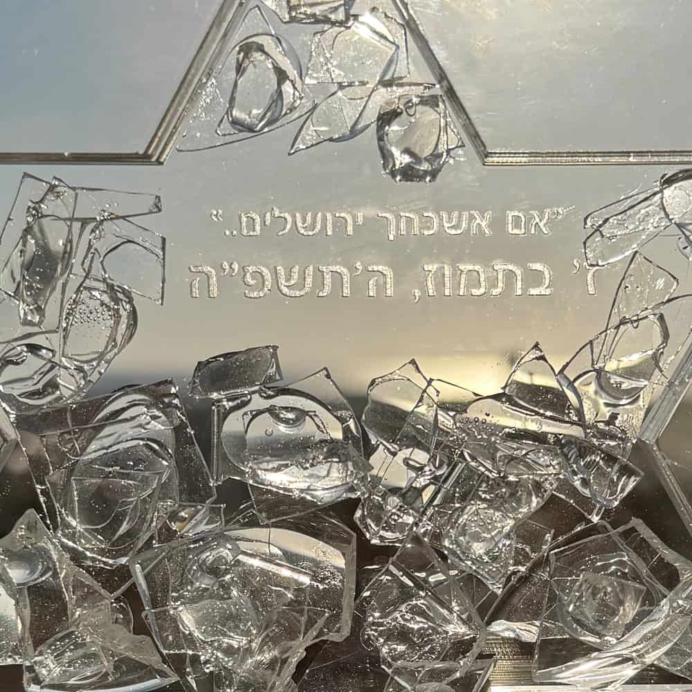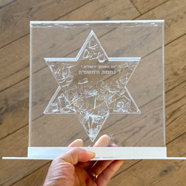 מגן דוד ייחודי עשוי פרספקס שקוף בגודל 20×20 ס״מ, המשלב בתוכו את שברי כוס החופה המקוריים שלכם.