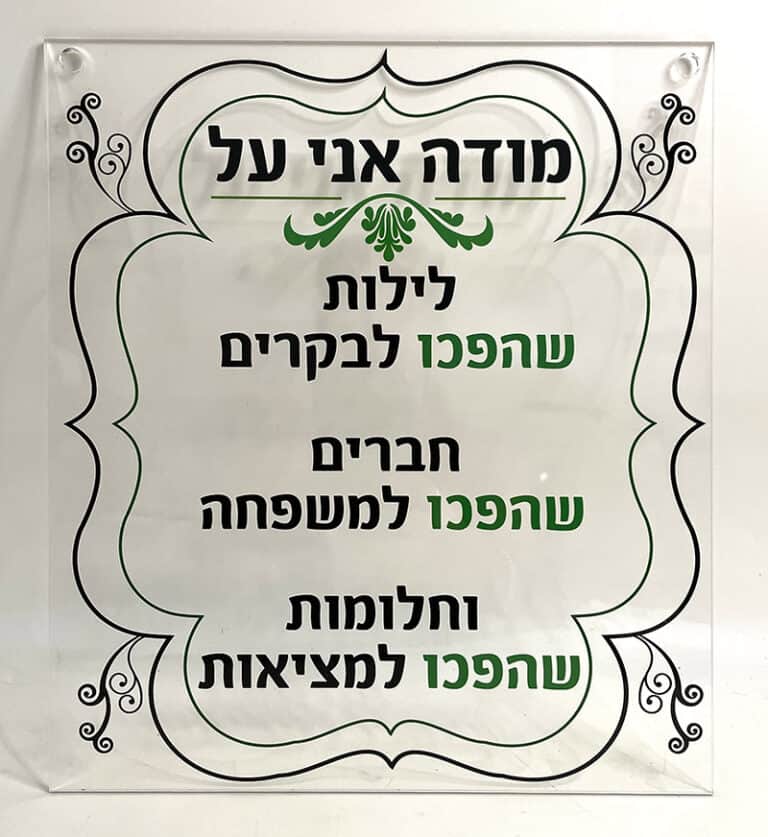 במיוחד בתקופה מאתגרת שכזו לכולנו, החלטתי לשתף במשפטים שליוו אותי לאורך חיי. משפטים אילו חיזקו אותי, הניעו אותי, עודדו אותי ובעיקר נתנו לי השראה, השראה לחיים. יהיו המון אפשרויות ובגדלים שונים. השלט הזה עשוי פרספקס 4 מ״מ. גודל: 24.5 ס״מ על 27.5 ס״מ. גודלו של השלט מתאים לכל חלל בו תחפצו לתלות אותו. כל שצריך הוא נעץ לקיר גבס ומסמר לקיר בטון. השלט מגיע ארוז והמשלוח עלינו באהבה. במידה ומעוניינים ברכישה של כמות מעל 20 שלטים -יש לדבר עם יעל ישירות – 052-8664516 המחיר אינו כולל מע"מ או משלוח